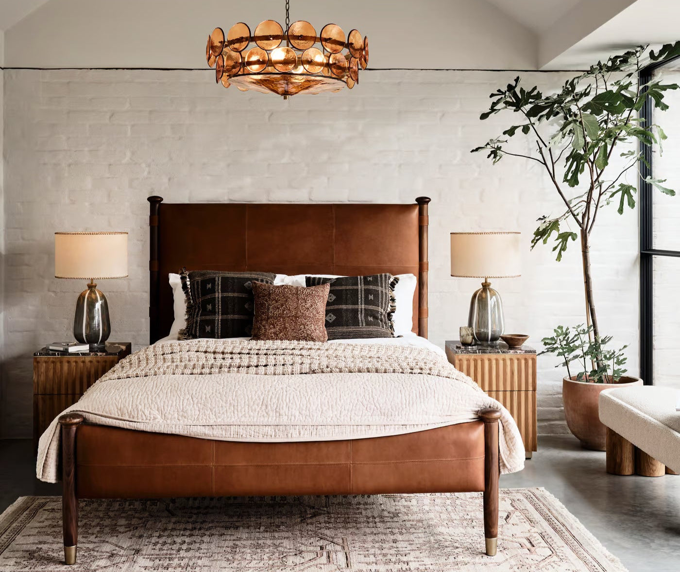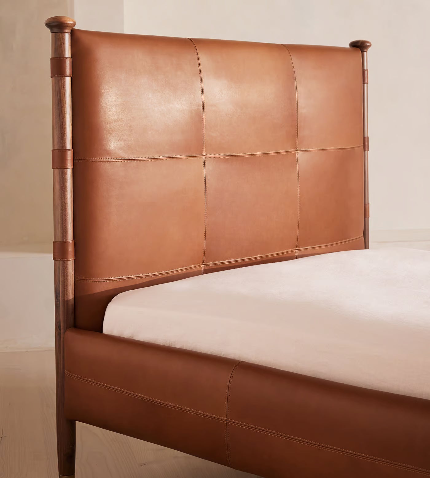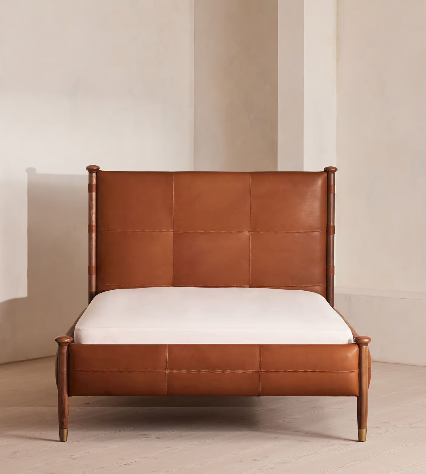 The Dorian Bed is a sculptural tribute to elemental craft and enduring presence. Handcrafted from solid walnut and wrapped in rich full-grain leather, it balances strength with quiet refinement. Turned posts rise like modern columns to anchor the form, while brass-capped feet lend a subtle gleam of sophistication.