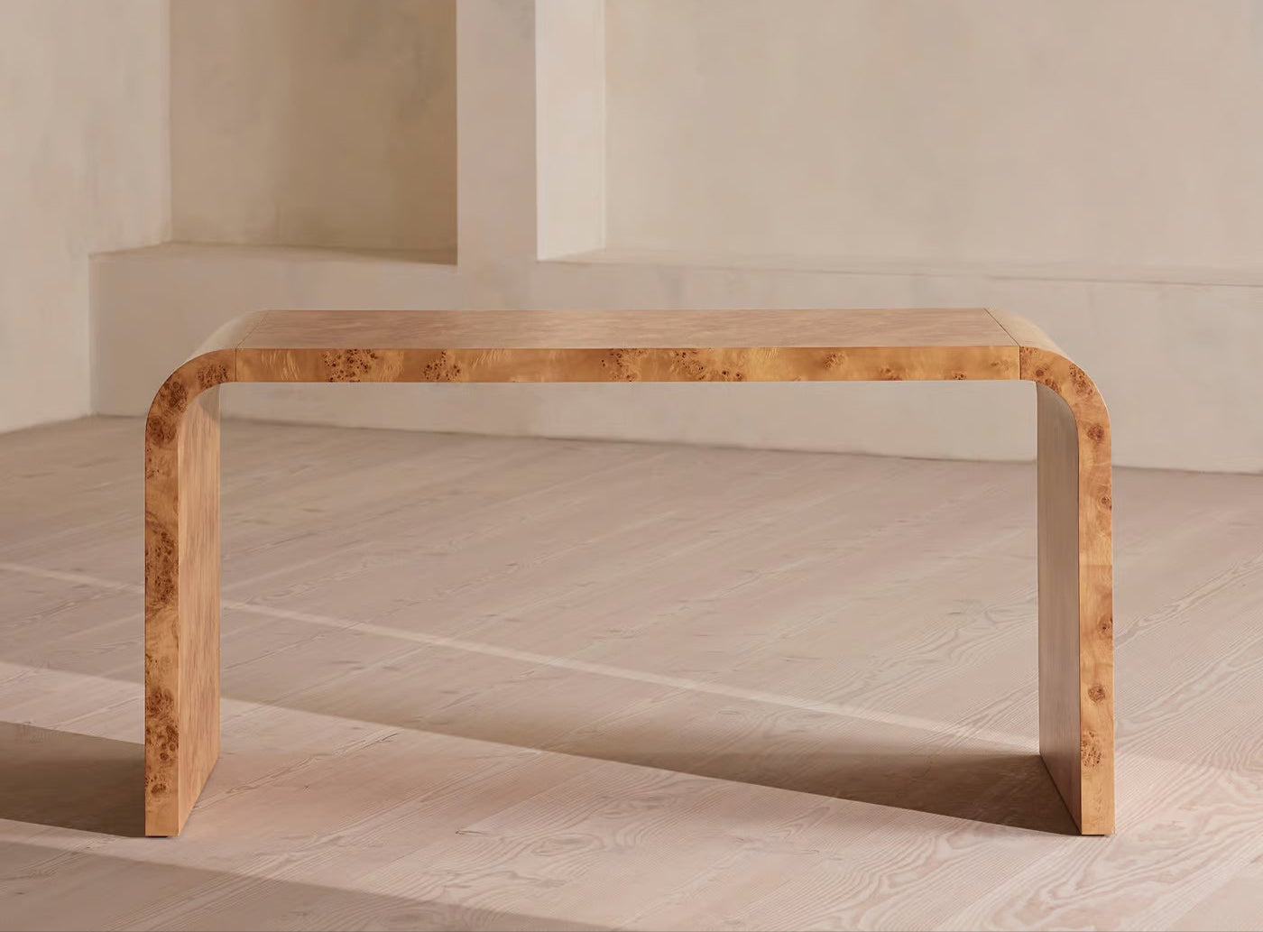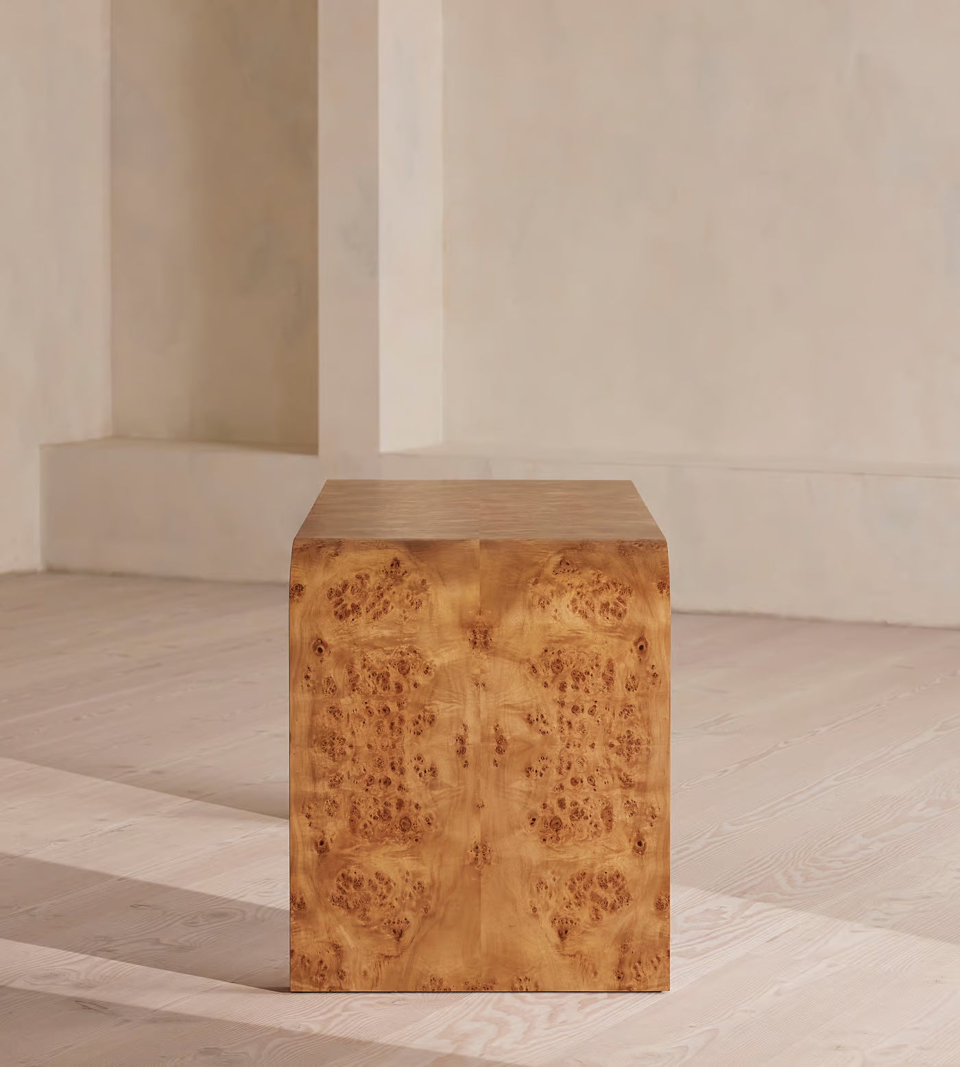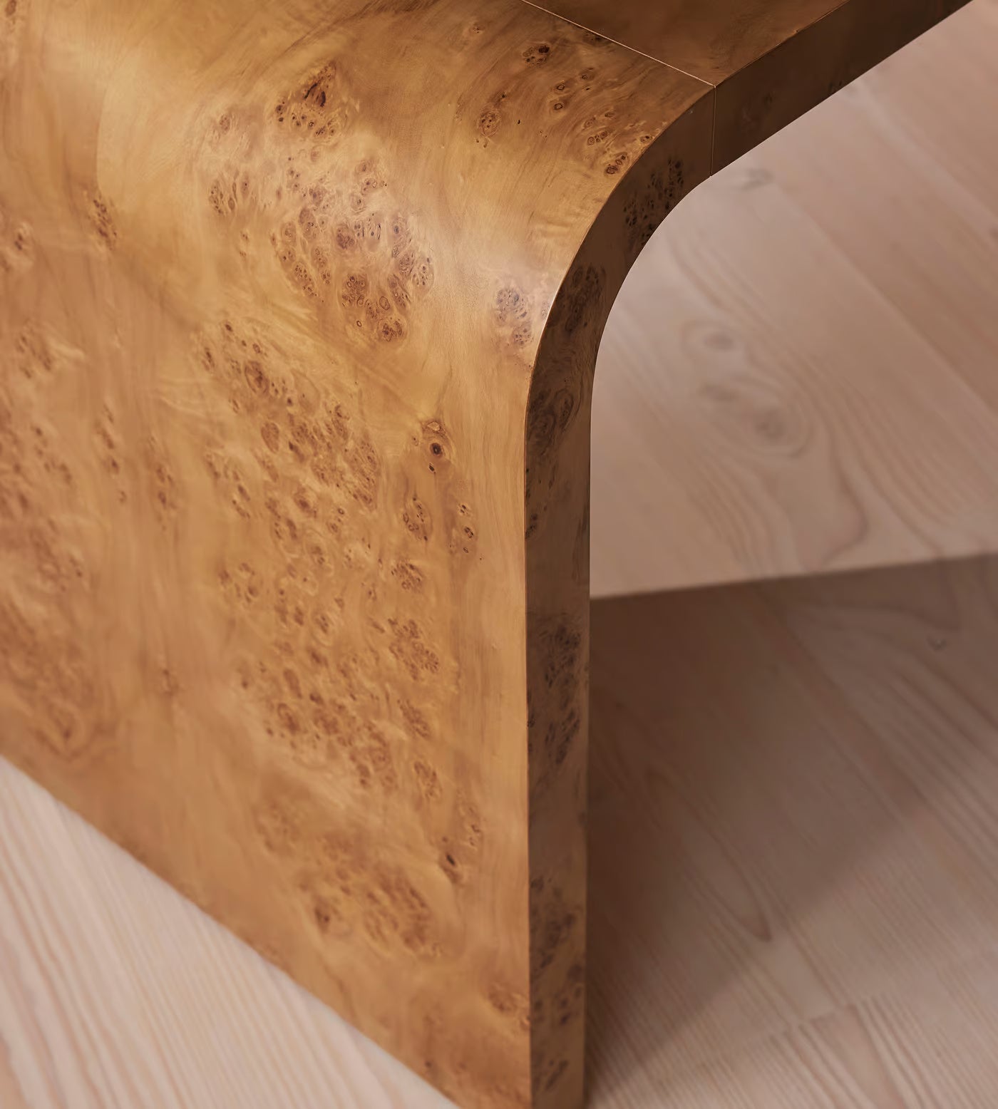The Ekatra Desk is an ode to unity and form. Crafted entirely from golden poplar burl veneer, its seamless curves and waterfall edges create the illusion of a monolithic structure. With no visible joins, it embodies the Sanskrit meaning of its name: "to be one." Designed for a minimalist workspace or as a focal console, Ekatra adds quiet drama through refined craftsmanship and organic texture.