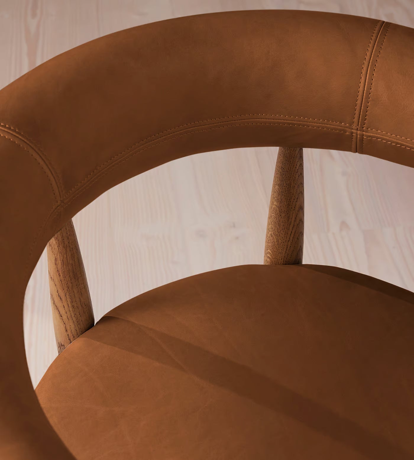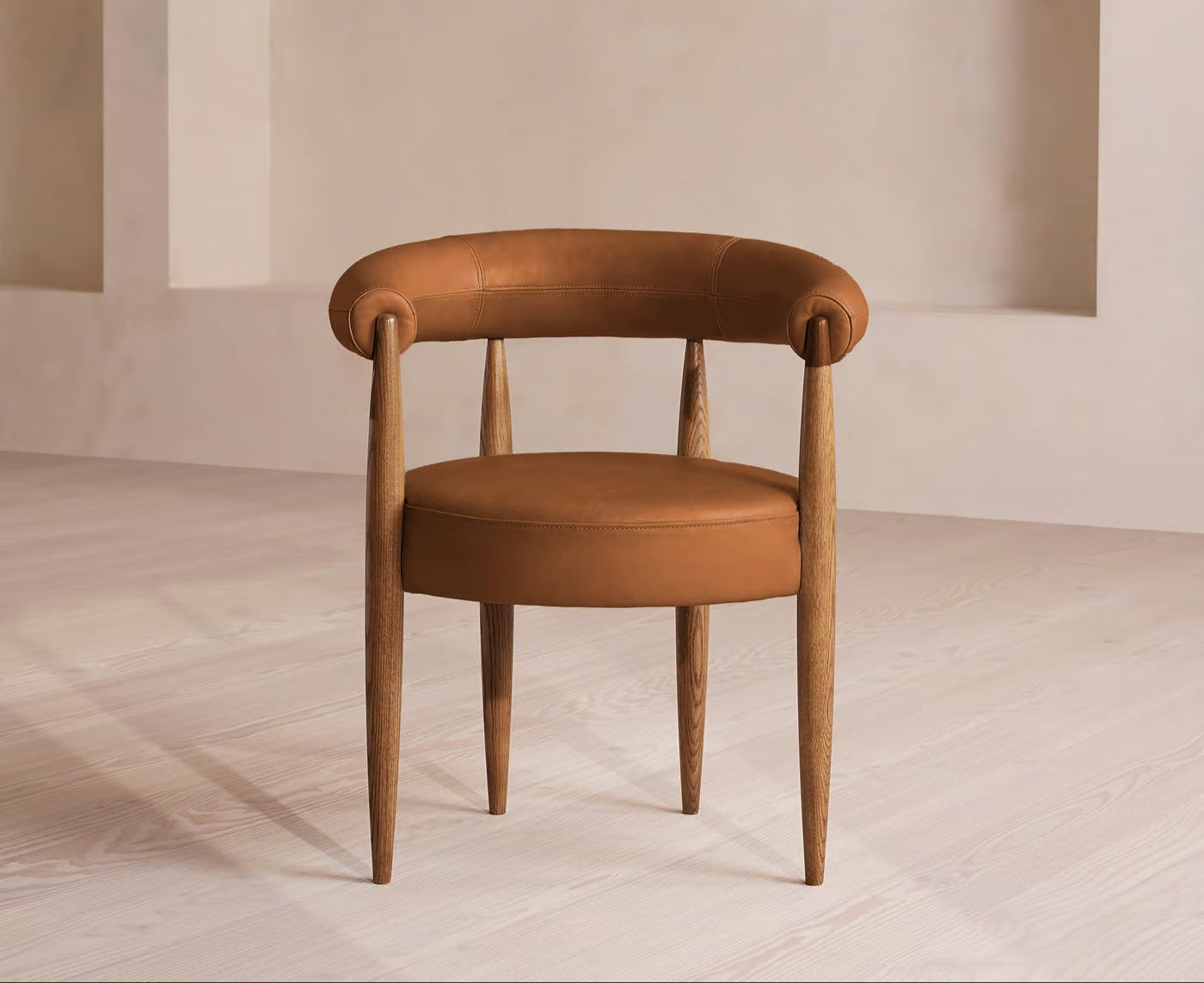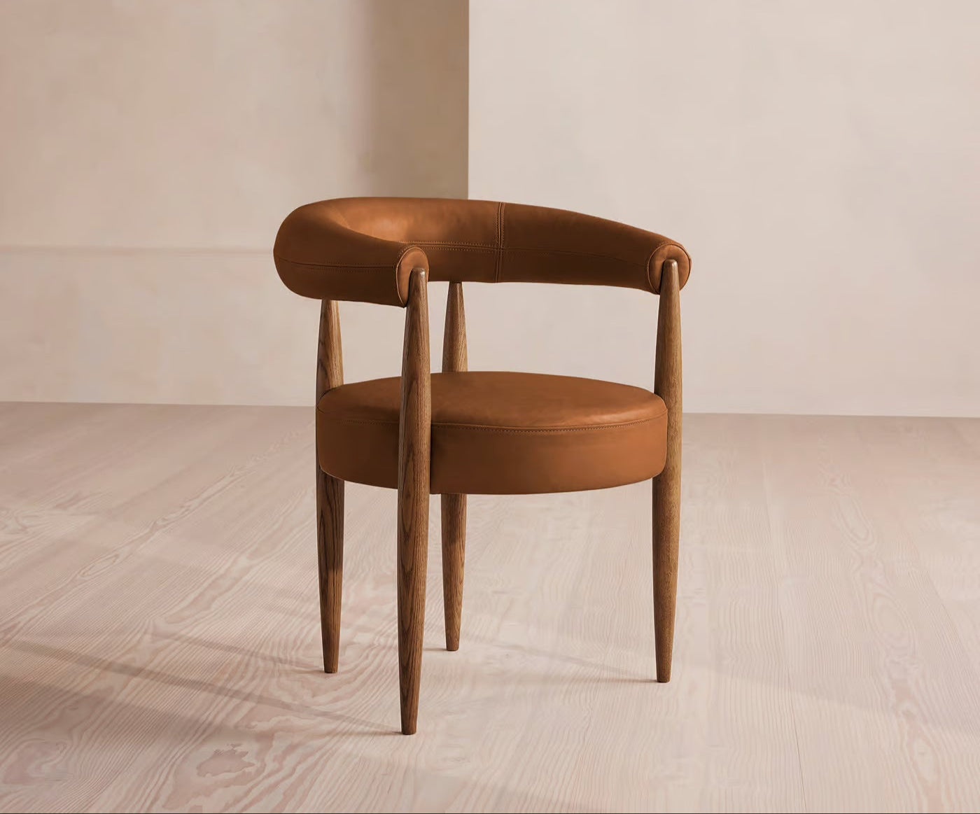 The Euklea Dining Chair is a sculptural composition of grace and intention. Crafted from tapered solid oak legs and a seamless circular frame, it balances warmth with discipline. A wrapped leather backrest curves into the seat like a continuous gesture, softening the geometry with tactile luxury.