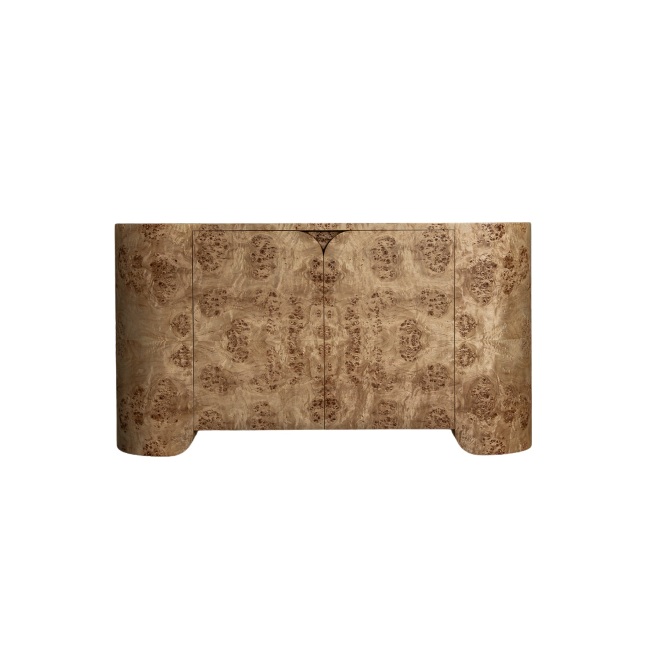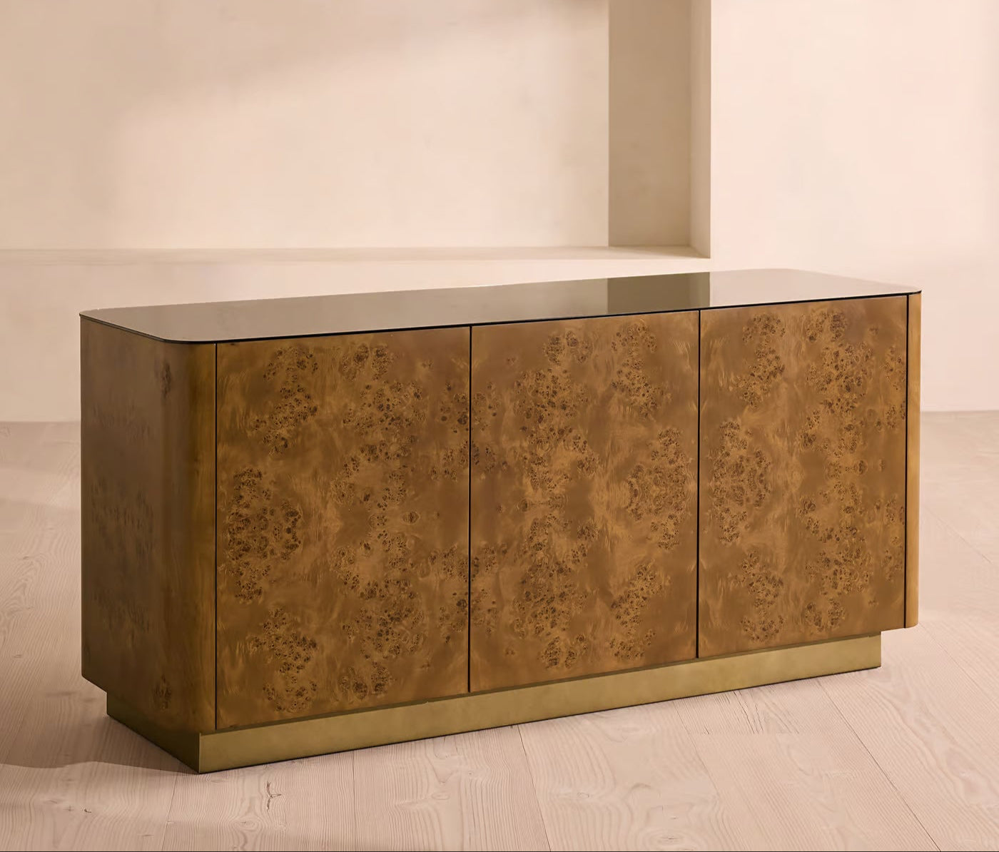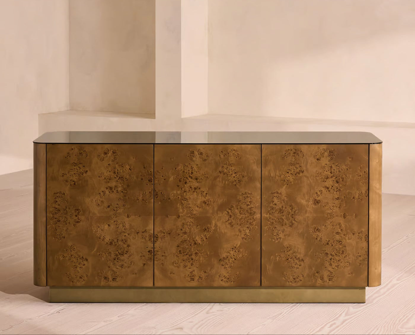 The Gaia Sideboard is a living tribute to the quiet artistry of nature. Crafted in mappa burl veneer — each surface uniquely patterned by time and growth — its clean lines frame the material’s wild beauty with modern restraint. Resting on a subtle brushed brass plinth, Gaia balances organic richness with sculptural clarity, creating a centerpiece that is both grounded and luminous.