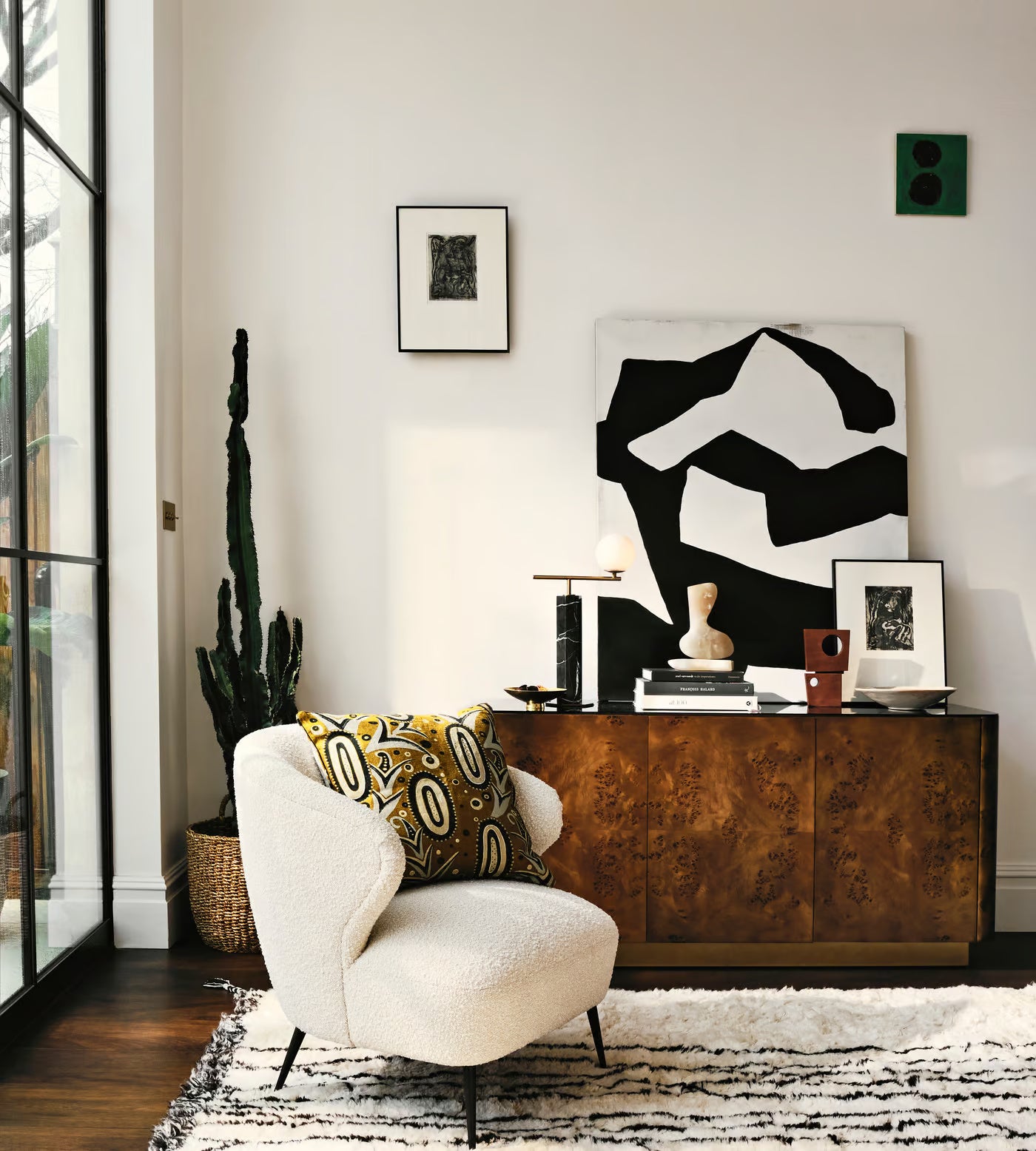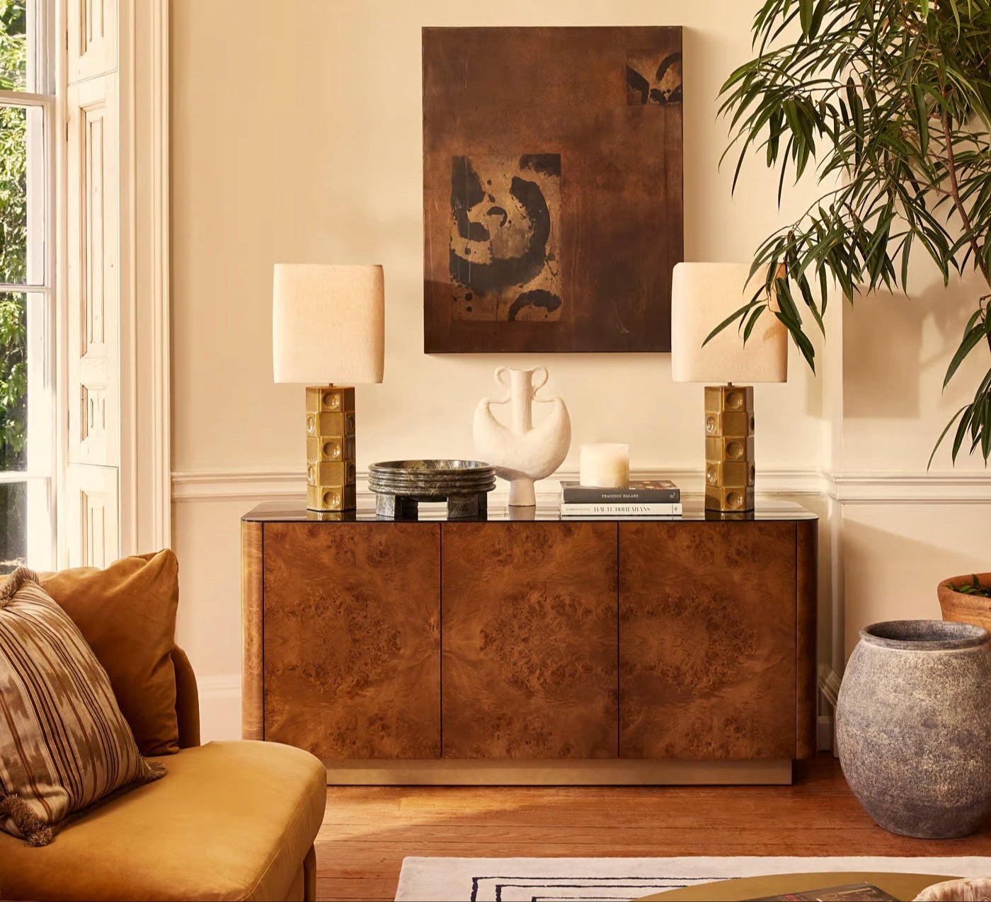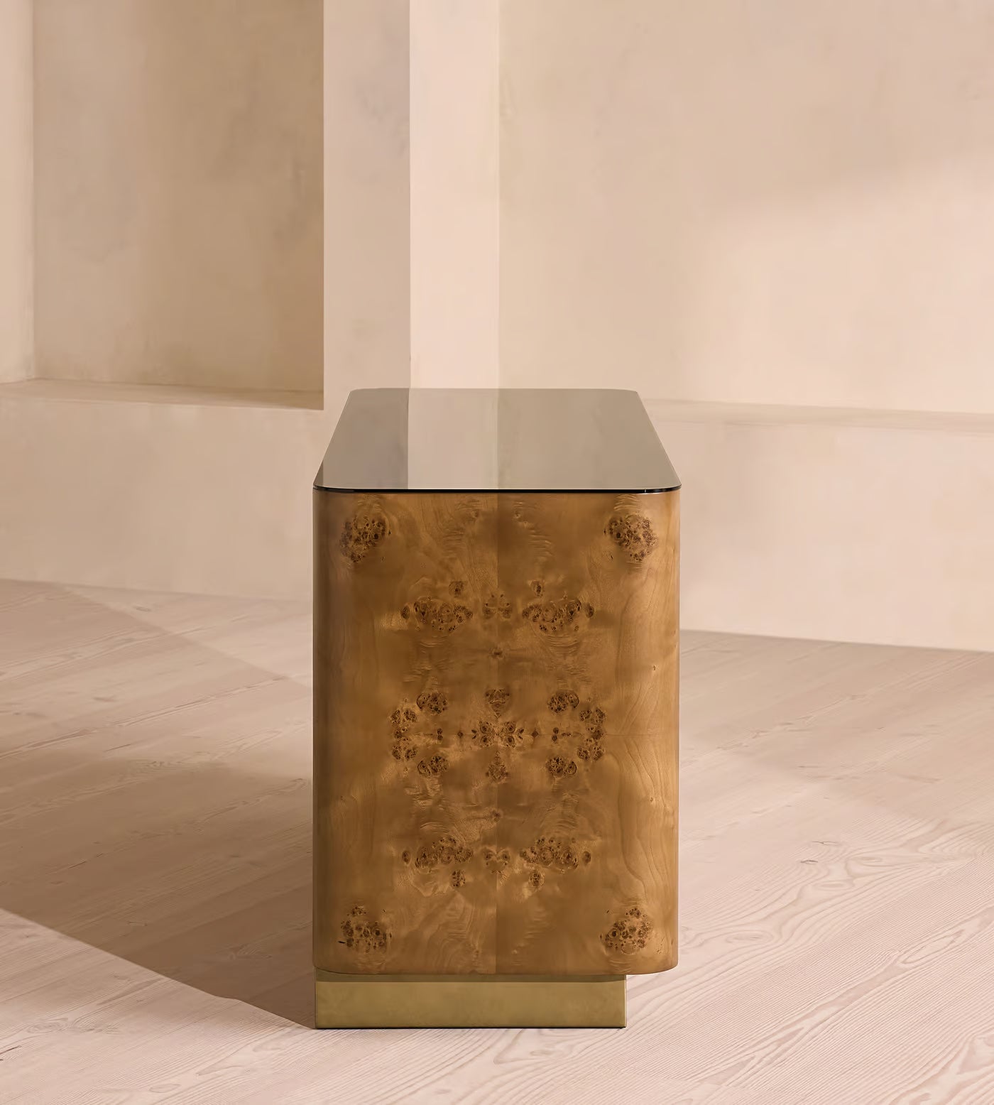 The Gaia Sideboard is a living tribute to the quiet artistry of nature. Crafted in mappa burl veneer — each surface uniquely patterned by time and growth — its clean lines frame the material’s wild beauty with modern restraint. Resting on a subtle brushed brass plinth, Gaia balances organic richness with sculptural clarity, creating a centerpiece that is both grounded and luminous.