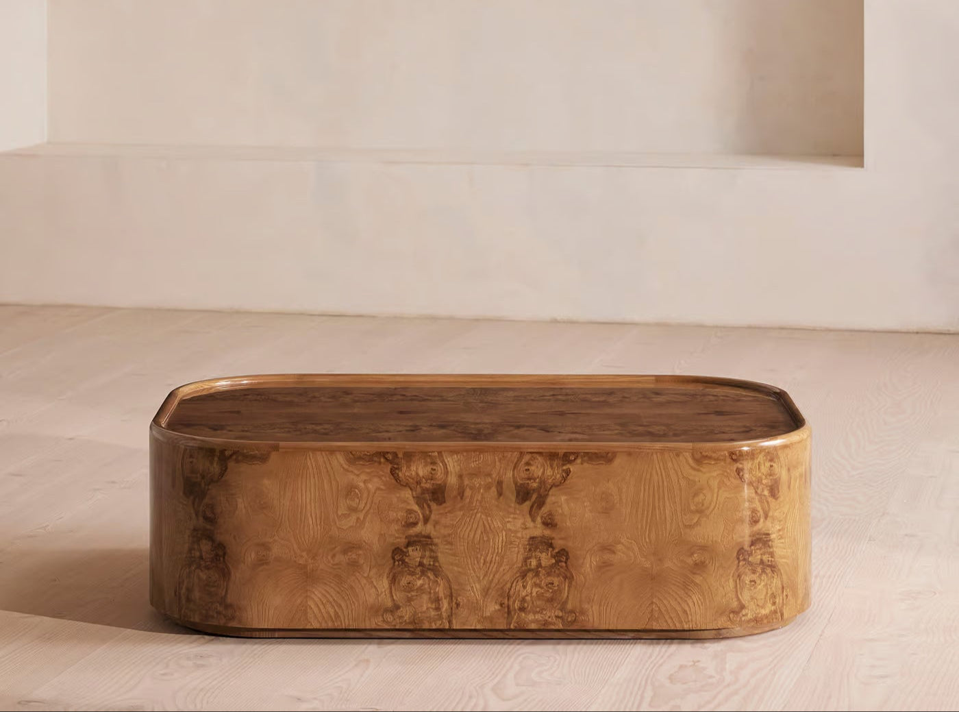 The Soma Coffee Table is a sculpted monolith of quiet elegance. Crafted in mirror-matched poplar burl, its swirling grain patterns unfold like topographies of the earth — no two alike. The softly pillowed edges and low-slung profile create a grounding presence, offering both function and a meditative pause in the center of the room.