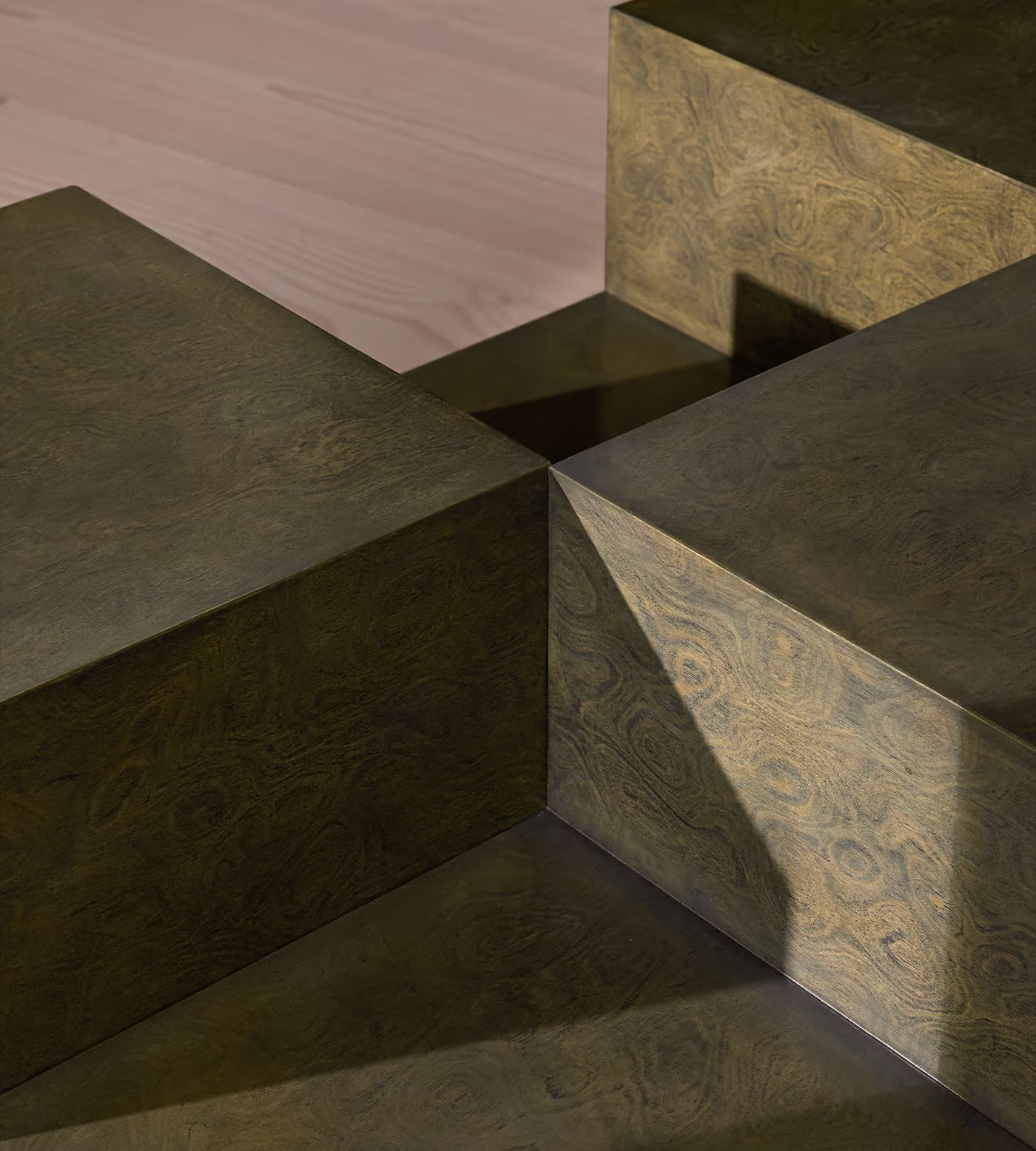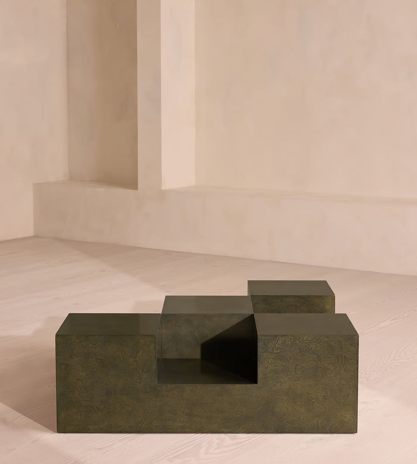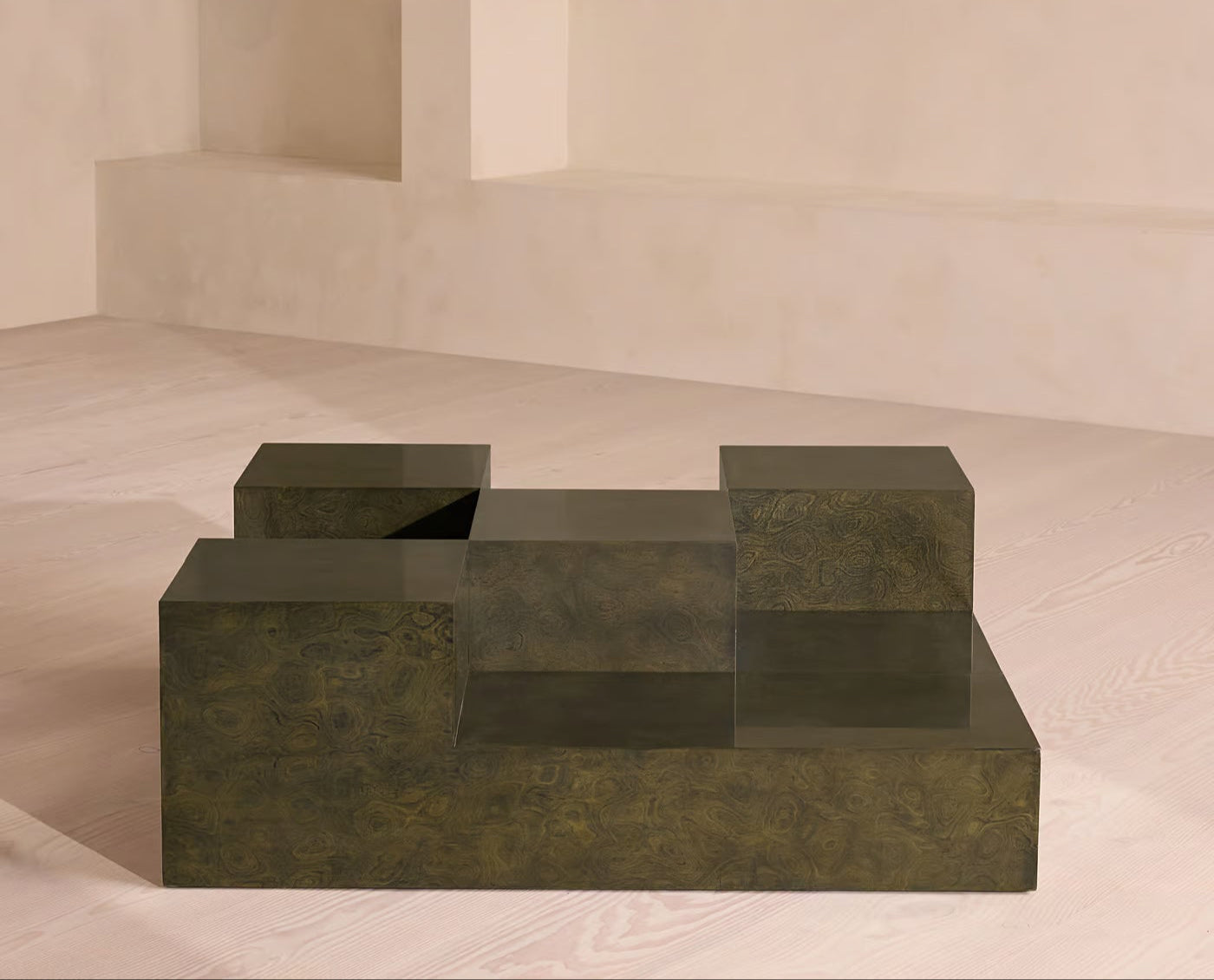 The Tessera Coffee Table is a sculptural grid of logic and elevation. Configured from interlocking block forms, it plays with height, mass, and void — creating a multidimensional surface that invites exploration. Finished in a deep olive green burl, the minimal geometry is softened by the subtle natural swirls, offering balance between intellect and materiality.
