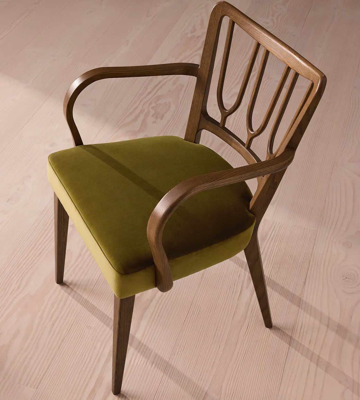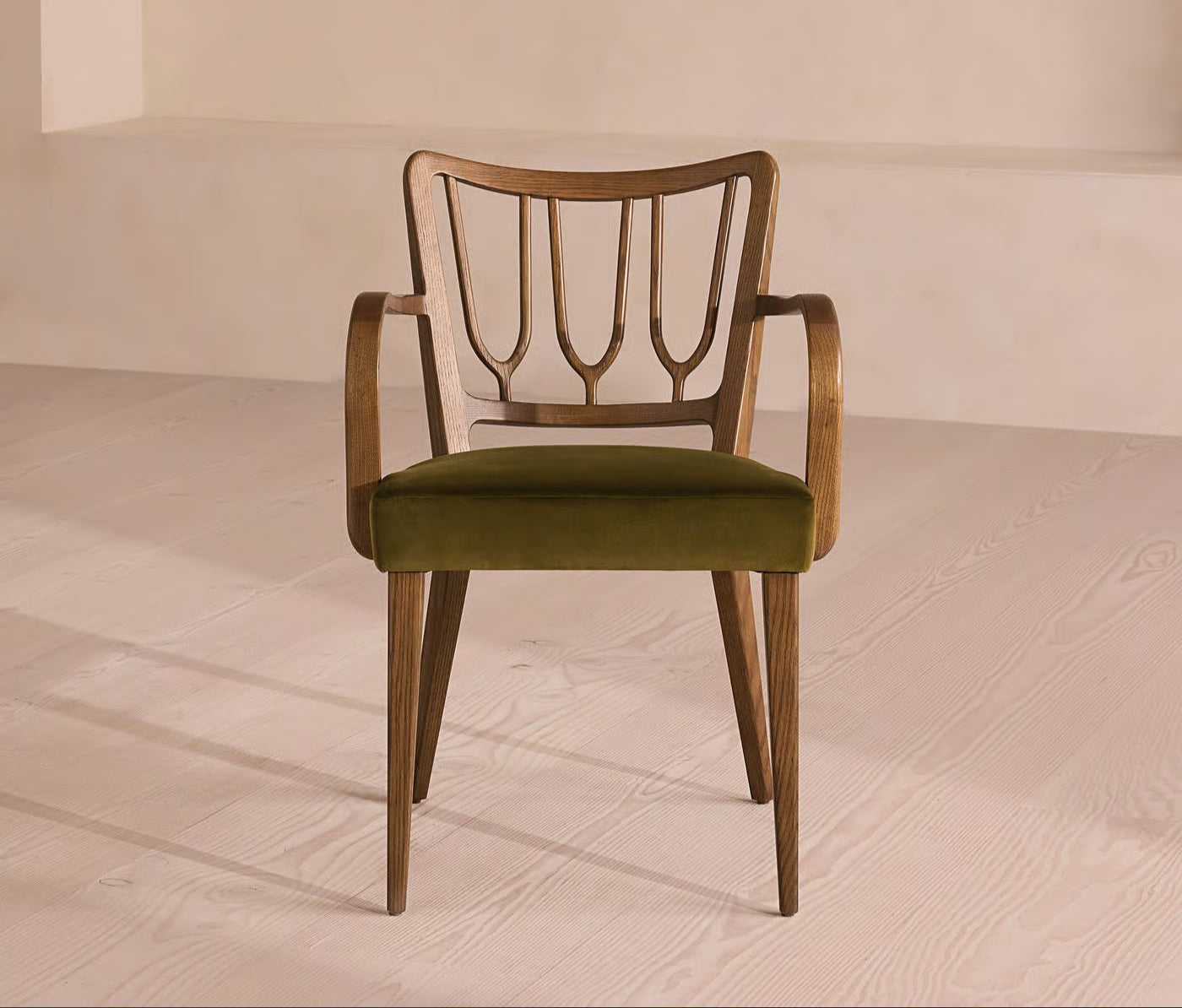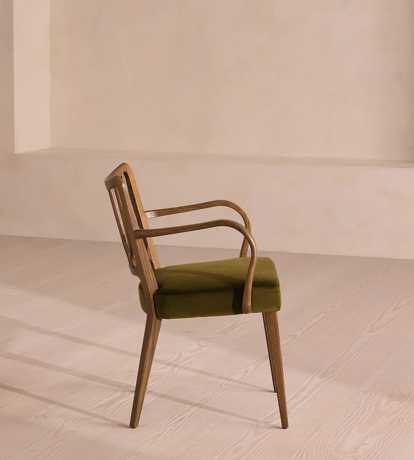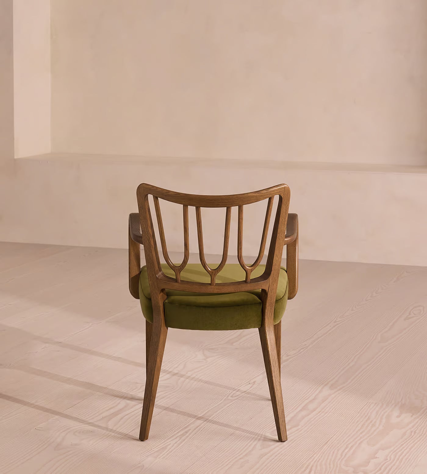 The Thalia Dining Chair merges classical influence with modern restraint. Crafted from solid oak, its curved backrest features spindles reminiscent of ancient instruments or arched gardens — lending rhythm and movement to a quiet silhouette. An olive green velvet seat provides warmth and plush tactility, while the sweeping arms and softly tapered legs anchor it with comfort.