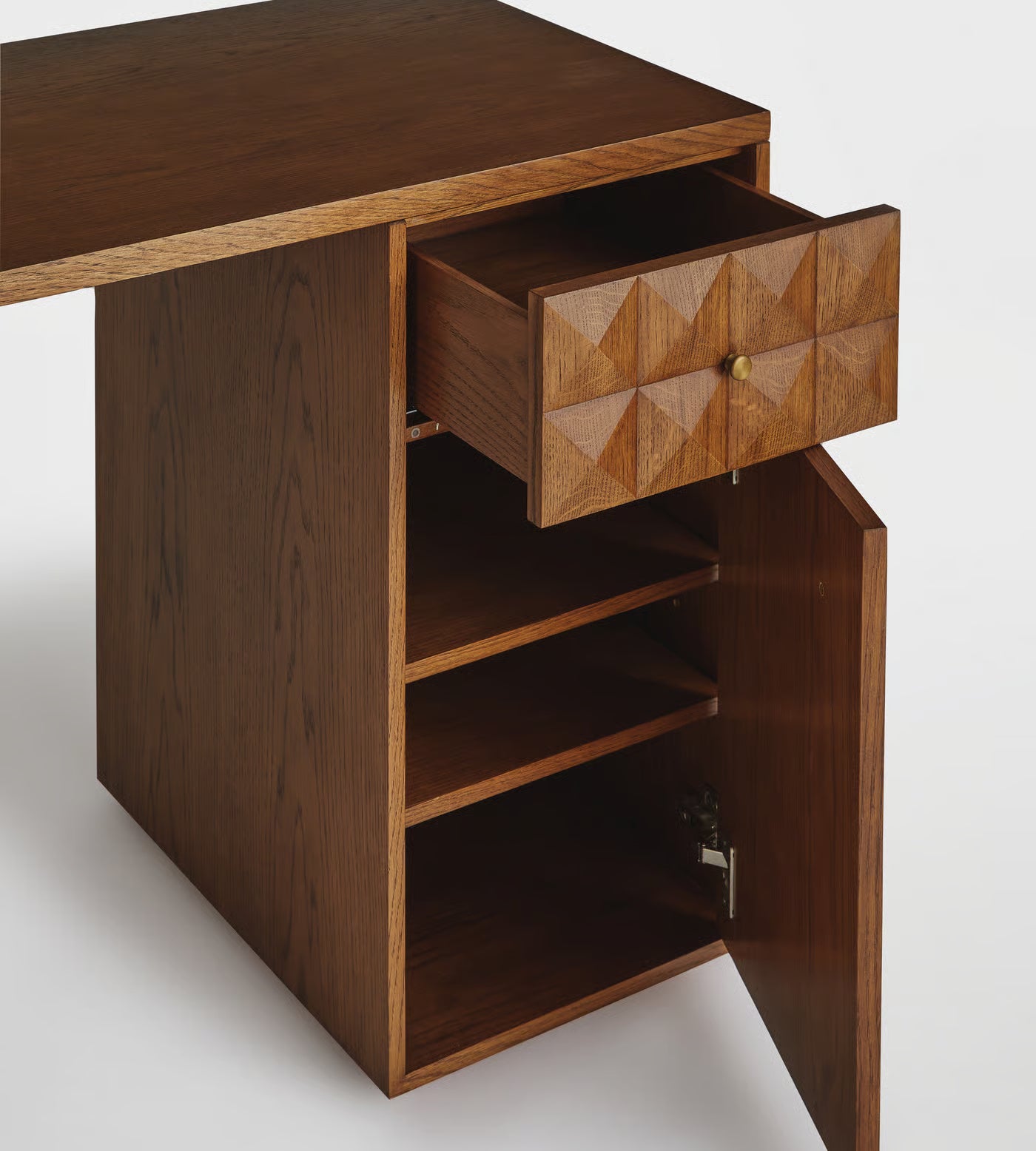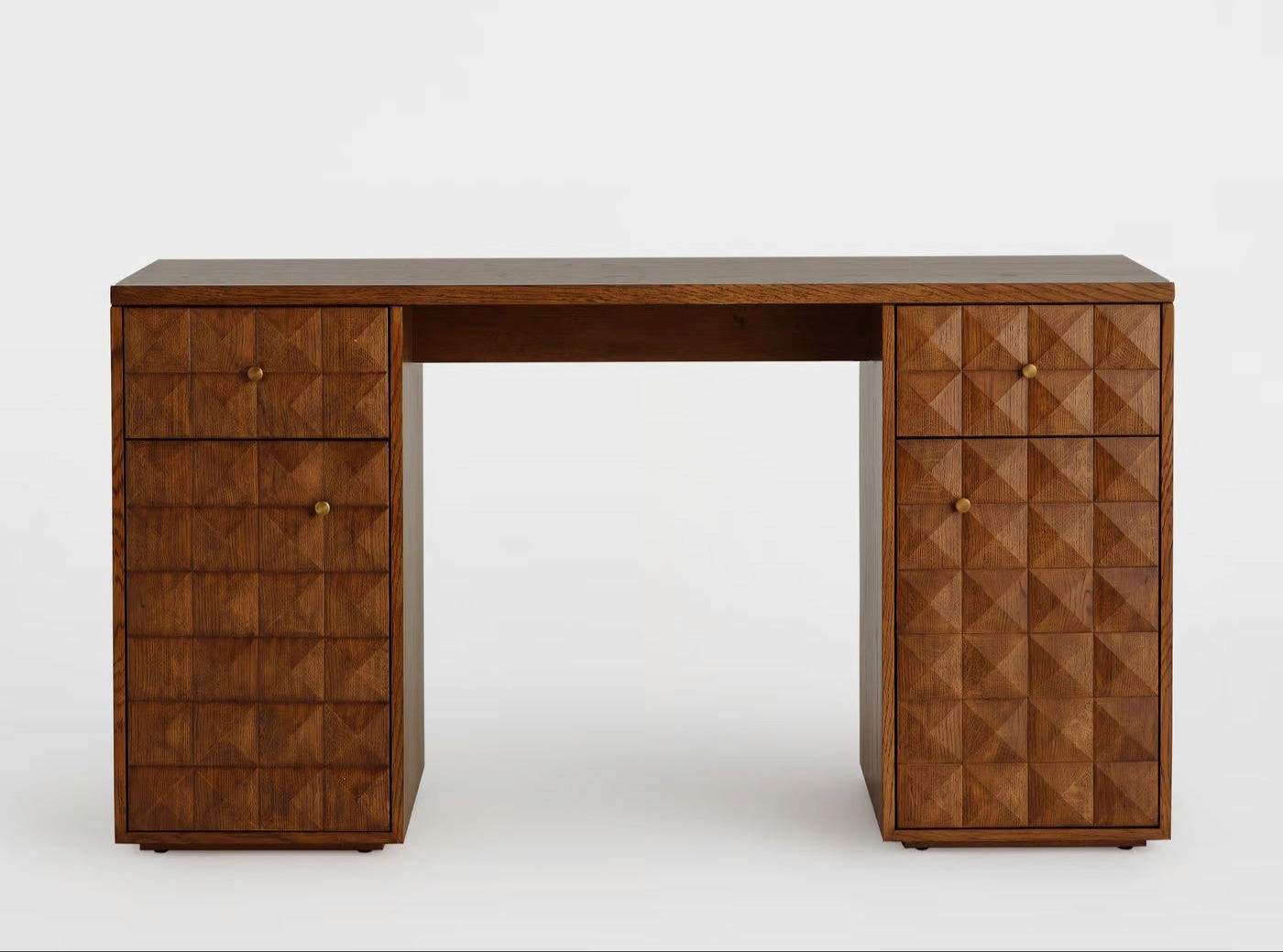 Carved with intent and structured for clarity, the Themnós Desk is a sanctuary for thought. Its faceted drawer fronts reference sacred geometry—where repetition creates rhythm and order. Crafted from rich walnut-stained oak, the desk exudes intellectual gravitas with a tactile presence.